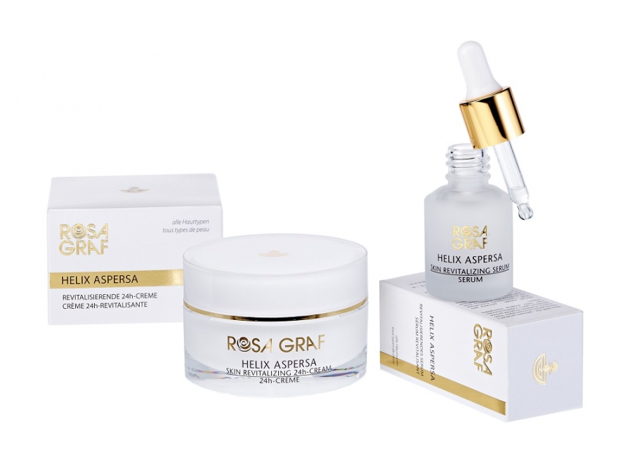 The innovative and highly effective HELIX ASPERSA care series from ROSA GRAF contains natural essence of snail extract as a main active ingredient. This natural product has fascinating cosmetic properties. Snail extract contains allantoin, collagen, elastin and glycolic acid in a natural way. These products protect the skin against environmental influences, strengthens the skin’s defense mechanisms, regenerates and firms the skin and provides lasting moisture.